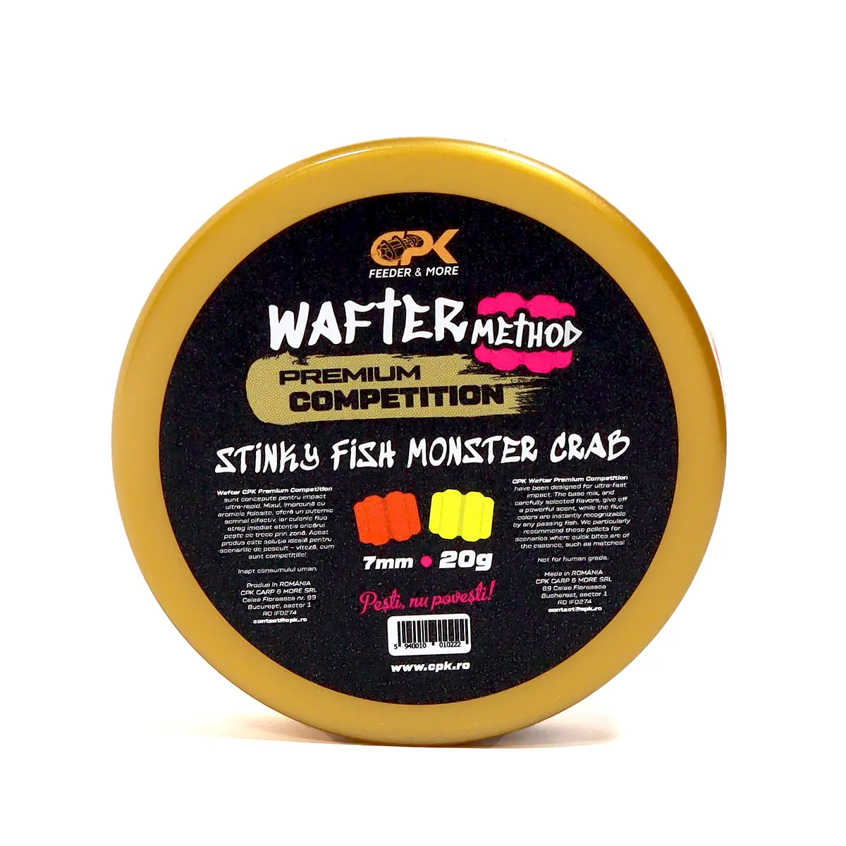 CPK Wafter Competition Method StinkyFish MonsterCrab sunt momeli de carlig critic echilibrate, gandite pentru eficienta maxima in toate scenariile de pescuit ce impun folosirea unor momeli de carlig discrete, insa imposibil de neglijat. Mixul a fost gandit minutios pentru a oferi echilibrul perfect intre flotabilitatea optima pentru prezentare corecta pe orice tip de substrat si granulatia ideala pentru a elibera rapid aromele si palatantii, transmitand crapilor un semnal de hranire irezistibil. Forma unica va pacali cu usurinta vigilenta crapilor, fiind si usor de atasat pe monturi cu banda elastica. Poturile contin mai multe culori, intrucat am dorit sa va oferim versatilitate totala, in mod special in pescuitul la feeder ce vizeaza specii multiple.